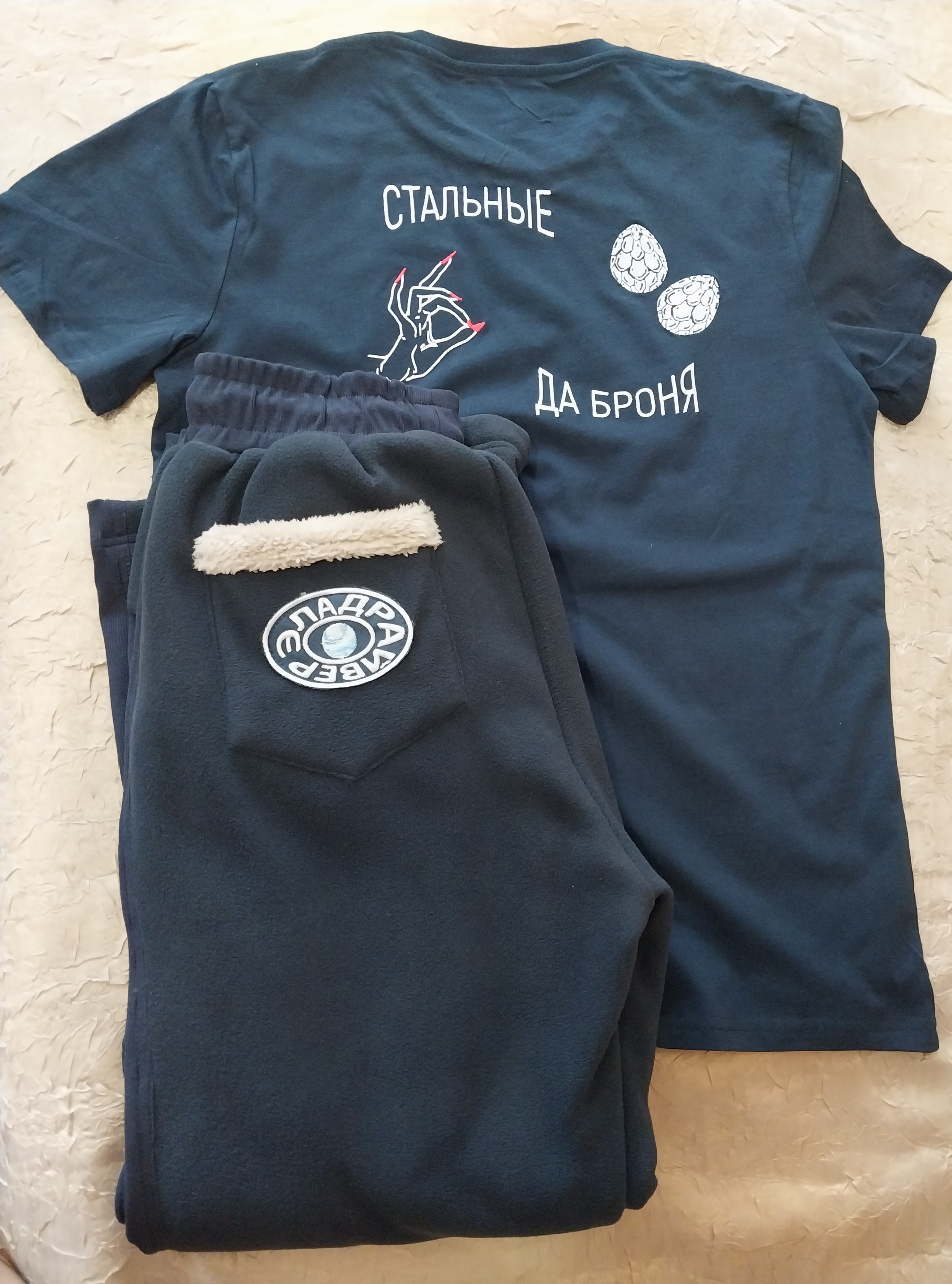 Теплые брюки "ШТУРМОВИК" с вышивкой изображения шершня. Брюки темно синего цвета из гипоаллергенного двустороннего материала. С внешней стороны бархатистые, изнутри меховые.